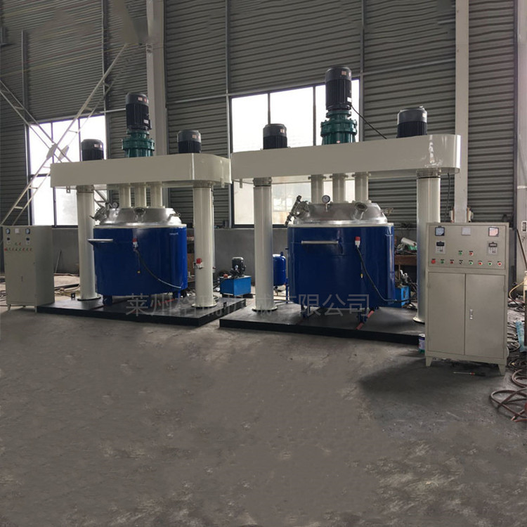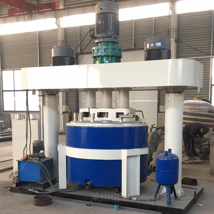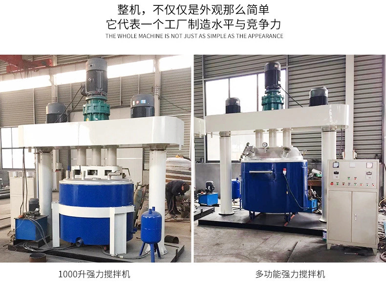 強(qiáng)力分散機(jī)有單速、雙速、變速三種速度可供選擇,滿足各種工藝要求。強(qiáng)力分散機(jī)釜內(nèi)有三根不同形式的攪拌器,其中一個(gè)攪拌器在繞釜體軸線轉(zhuǎn)動(dòng),其余兩個(gè)攪拌裝置又以不同的轉(zhuǎn)速繞自身軸線高速自轉(zhuǎn),使物料在釜內(nèi)作復(fù)雜的運(yùn)動(dòng),受到強(qiáng)烈的剪切和搓合。設(shè)備內(nèi)有“山”形刮底繞釜體軸線轉(zhuǎn)動(dòng),將粘在壁上和底部的原料刮出參與混合,使其效果更為理想。設(shè)備密封性好,可抽真空,具有良好的排氣除泡效果。設(shè)備缸蓋可液壓升降,缸體可自由移動(dòng),操作十分方便。攪拌器的形式,根據(jù)物料要求可為多層槳葉式、框式、蝴蝶式、葉輪式。